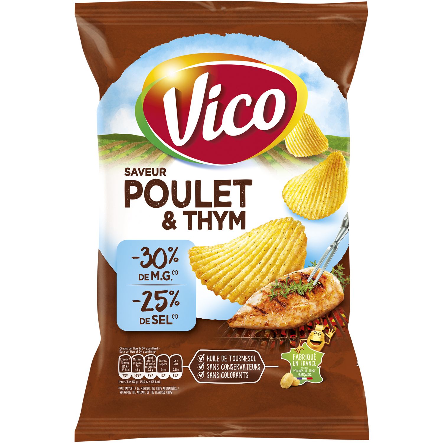 Découvrez les Chips Vico Saveur Poulet et Thym allégées en MG et Sel. Toujours aussi savoureuses, elles permettent de se faire plaisir sans culpabiliser ! Chips ondulées de Pommes de Terre allégées en matières grasses et en sel, saveur poulet thym