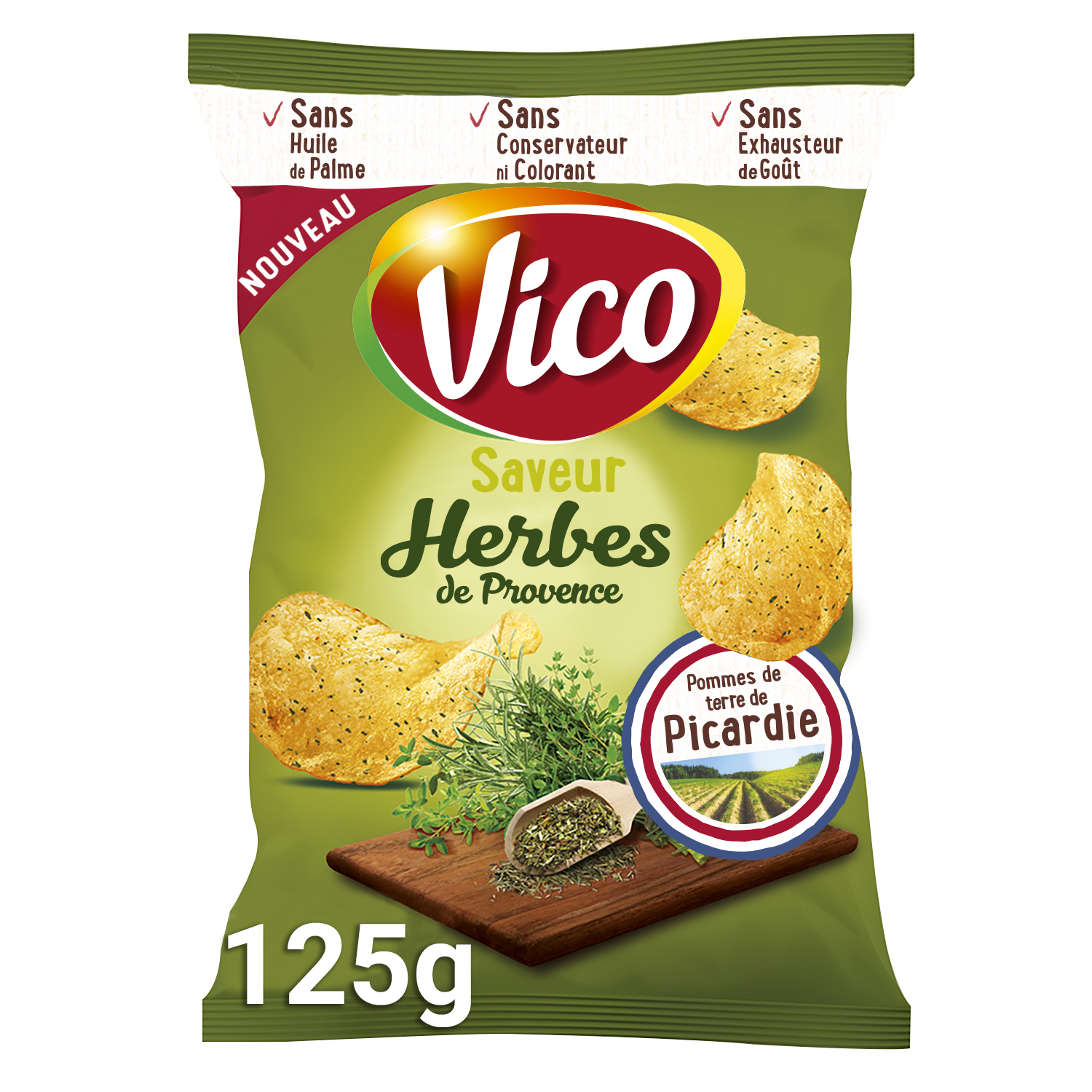 Laissez-vous tenter par les chips lisses Herbes de Provence de VICO ! Une saveur incontournable et intensément gourmande pour un plaisir garanti ! Une recette sans exhausteur de goût, sans huile de palme, sans colorant, sans conservateur. En plus, elles sont produites en France dans l'usine VICO de Vic-sur-Aisne, à partir de pommes de terre françaises !