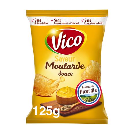 Laissez-vous tenter par les chips lisses Moutarde Douce de VICO ! Une saveur incontournable et intensément gourmande pour un plaisir garanti ! Une recette sans exhausteur de goût, sans huile de palme, sans colorant, sans conservateur. En plus, elles sont produites en France dans l'usine VICO de Vic-sur-Aisne, à partir de pommes de terre françaises !