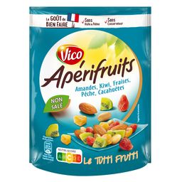 L'Apérifruits Tutti Frutti c'est un mélange de cacahuètes, de kiwis, de pêches, de fraises et d'amandes. Une alliance de fruits originaux et de graines gourmandes pour le plus grand plaisir de vos papilles. Offrez à vos invités un moment unique de fraîcheur et d'évasion… Grâce au mélange Apérifruits Tutti frutti et à son association de fruits originaux et de graines gourmandes, réveillez vos sens à l'apéritif!