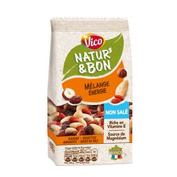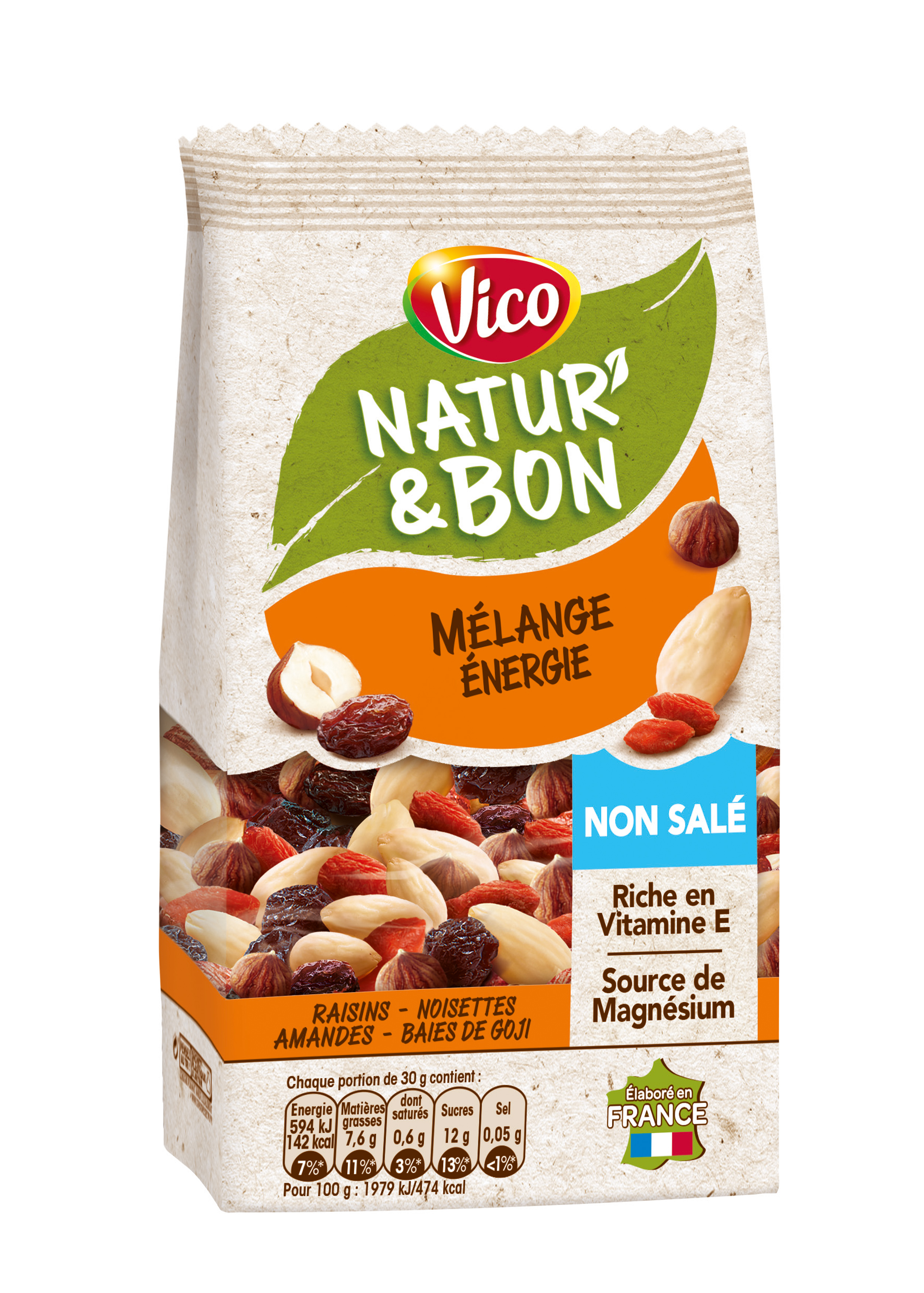 Le Mélange Energie Natur’ & Bon est un assortiment audacieux alliant la douceur des baies de goji au croquant des amandes et des noisettes et à la rondeur des raisins secs. Un mélange de noix et de fruits à déguster en famille … ou à grignoter selon ses envies ! Ce mélange de noix et de fruits, sans sel ajouté*, sans colorants ni conservateurs, est riche en vitamine E qui contribue à protéger les cellules contre le stress oxydatif et source de magnésium qui contribue à réduire la fatigue. *la teneur en sel est exclusivement due à la présence de sodium présent naturellement dans le produit ou la graine. Mélange énergie
