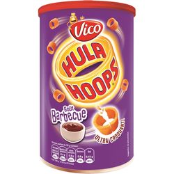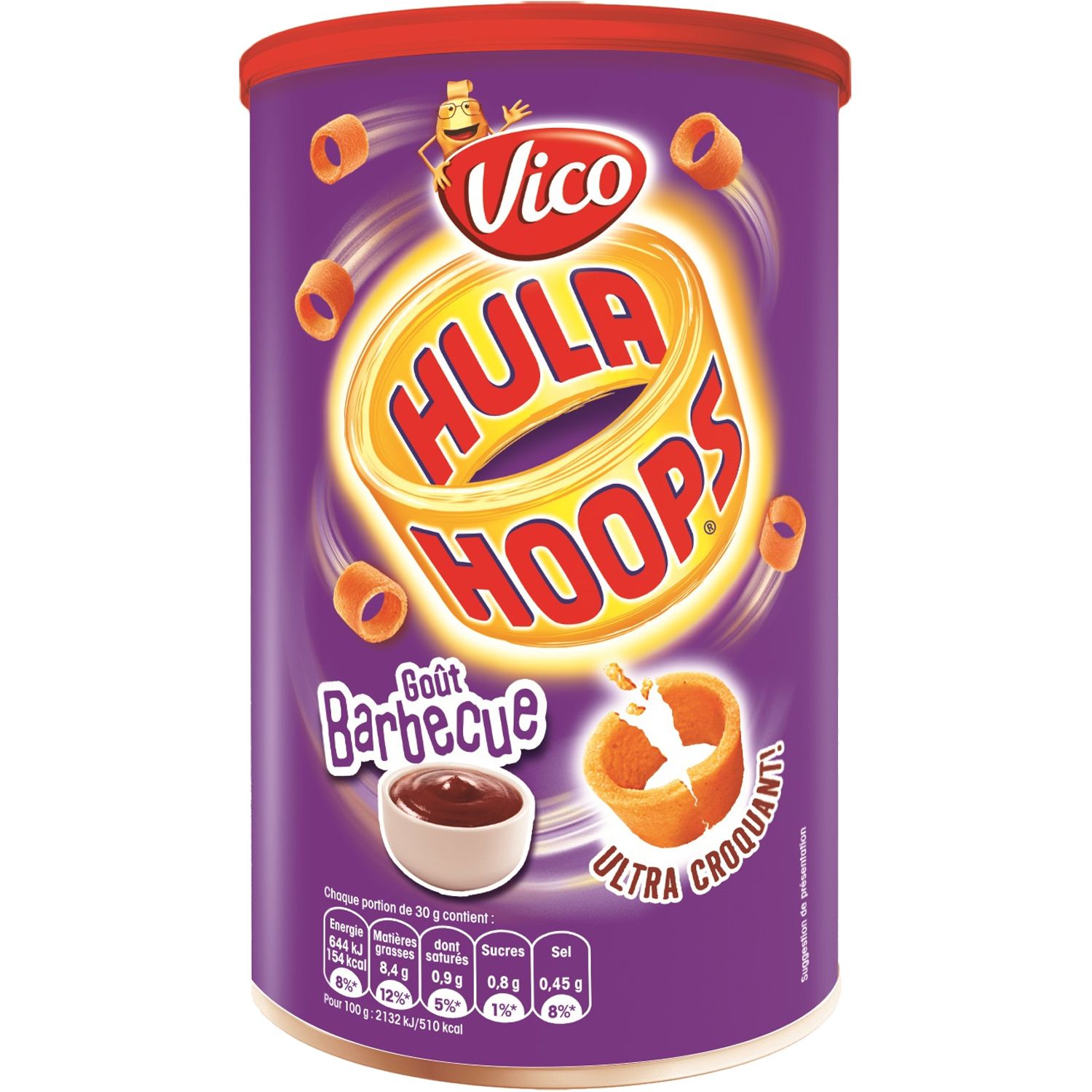 Découvrez HULA HOOPS de VICO, des biscuits apéritifs craquants, en forme d'anneau ludique, qui plairont à coup sûr aux petits comme aux grands pour de bons moments partagés ! Produit soufflé à base de pomme de terre , goût barbecue