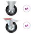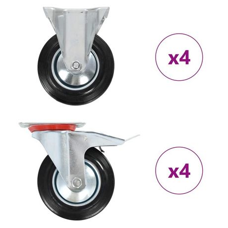 Ces roulettes sont fabriquees en caoutchouc qui se distingue par une bonne resistance aux chocs et aux vibrations, permettant a ces roulettes de fonctionner en douceur et silencieusement. De plus, leurs surfaces douces protegent efficacement votre sol des egratignures. En outre, le cadre en fer zingue est hautement resistant a la rouille et ajoute ainsi a la robustesse et a la durabilite de la roulette pivotante. Moitie de ces roulettes pivotantes sont equipees de freins pour controle flexible. Chaque roulette pivotante a une capacite de charge maximale de 150 kg.