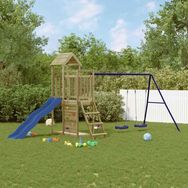 Vous voulez donner à vos enfants la liberté de jouer à la maison ? Cet ensemble de jeu d'extérieur en bois transforme votre jardin en un terrain de jeu propice aux aventures imaginatives ! Matériau durable : ce cadre d'escalade avec toboggan est fabriqué en bois de pin imprégné sous vide. Le bois de pin massif est un matériau naturel magnifique. Le bois de pin a un grain droit et les nœuds lui confèrent un aspect rustique caractéristique. L'imprégnation est un processus de conservation réalisé à l'aide d'autoclaves. Le traitement sous pression augmente la résistance à la pourriture et aux intempéries. Cadre robuste et stable : le cadre en bois du cadre d'escalade de jardin assure la robustesse et la stabilité. De plus, les pieds en forme de A de la balançoire pour enfants permettent de garder l'équilibre.Centres multi-activités : le cadre d'escalade est doté d'une plate-forme de 90 cm de hauteur et se distingue par son toboggan ondulé, une échelle, une balançoire double, une paroi rocheuse ainsi qu'un bac à sable. Vos enfants peuvent également inviter leurs amis à se joindre à eux. Conception réfléchie : les balustrades en bois entourant sont conçues pour assurer la sécurité des enfants pendant qu'ils s'amusent. De plus, le toit en bois offre de l'ombre à vos enfants pendant les chaudes journées d'été. Plaisir sans fin : cette maisonnette de jeu extérieure en bois est le moyen idéal pour vos enfants et leurs amis de se divertir, d'avoir plus de temps interactif et de créer des souvenirs pour vous et vos enfants ! Attention :Uniquement pour un usage domestiqueUtilisation extérieure Ne convient pas aux enfants de moins de 3 ans Âge recommandé : 3-8 ans Remarque :Le produit doit être ancré afin de réduire les risques de basculement. Les ancrages ne sont pas inclus. Bon à savoir :Pour faciliter au maximum le montage, chaque produit est livré avec des instructions. Dimensions totales : 446 x 186 x 214 cm (L x l x H) Tour de jeu :Matériau : bois de pin imprégné sous pression sous videDimensions : 110 x 64 x 214 cm (L x l x H)Hauteur de la plateforme : 90 cmEnsemble de balançoire double :Couleur : bleu Matériau : PP (polypropylène), métalDimensions totales : 255 x 160 x 162 cm (l x P x H)Dimensions de la balançoire : 32,5 x 22 x 112,5 cm (l x P x H)Toboggan ondulé :Couleur : bleu Matériau : PP (Polypropylène)Dimensions : 169 x 38,5 cm (L x l)Hauteur d'installation applicable : 90 cmLargeur totale du toboggan : 38,5 cmLargeur de la partie coulissante : 32 cmPoids maximum de l'utilisateur : 45 kgLes vis de la plateforme de montage (M3,5 x 28 mm) sont inclusesCaractéristiques :1 x tour de jeu1 x échelle1 x paroi rocheuse1 x ensemble de balançoire double1 x toboggan ondulé Avertissement. Ne convient pas aux enfants de moins de 3 ans. Usage domestique uniquement. GPSRDimensions totales : 446 x 186 x 214 cm (L x l x H) Tour de jeu :Matériau : bois de pin imprégné sous pression sous videDimensions : 110 x 64 x 214 cm (L x l x H)Hauteur de la plateforme : 90 cmEnsemble de balançoire double :Couleur : bleu Matériau : PP (polypropylène), métalDimensions totales : 255 x 160 x 162 cm (l x P x H)Dimensions de la balançoire : 32,5 x 22 x 112,5 cm (l x P x H)Toboggan ondulé :Couleur : bleu Matériau : PP (Polypropylène)Dimensions : 169 x 38,5 cm (L x l)Hauteur d'installation applicable : 90 cmLargeur totale du toboggan : 38,5 cmLargeur de la partie coulissante : 32 cmPoids maximum de l'utilisateur : 45 kgLes vis de la plateforme de montage (M3,5 x 28 mm) sont inclusesCaractéristiques :1 x tour de jeu1 x échelle1 x paroi rocheuse1 x ensemble de balançoire double1 x toboggan ondulé
