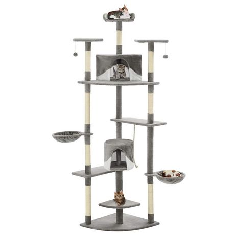 Vos amis felins peuvent aiguiser leurs griffes sur les griffoirs enroules dans des cordes en sisal, qui fournissent une bonne pratique pour leurs instincts a gratter. Ils aimeront egalement courir apres l'autre tout en sautant de haut en bas dans ce centre de jeu amusant. Au sommet de l'arbre a chat, il y a deux jouets suspendus qui vont eveiller vos chats curieux. Quand ils s'amusent suffisamment, vos petits amis adoreront se reposer sur les plates-formes superieures, ou ils auront une meilleure vue. Ils peuvent egalement se cacher dans les maisons confortables pour faire une sieste, ou se detendre sur les paniers confortables.