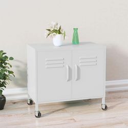 Cette armoire de rangement est fabriquee en acier, ce qui la rend robuste et stable. L'etagere reglable offre un grand espace de rangement pour garder vos DVD, appareils multimedia, livres et petits objets essentiels organises et a portee de main. L'armoire est equipee de quatre roues pour un deplacement facile. Les deux roues avant sont equipees de freins pour eviter tout deplacement accidentel. Elle est egalement facile a nettoyer avec un chiffon humide.