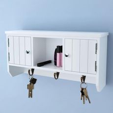 L'armoire murale dispose de trois crochets metalliques pour placer les cles. Les deux compartiments avec portes et l'etagere centrale offrent beaucoup d'espace pour ranger les portefeuilles, les telephones portables, les lunettes de soleil, les bijoux ou d'autres accessoires.