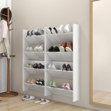 L'armoire a chaussures est equipee de 2 etageres basculantes pour ranger vos chaussures, bottes et pantoufles de maniere organisee et bien rangee. Ce porte-chaussures est monte au mur, ce qui peut economiser de l'espace pour rendre votre entree bien organisee et garder le sol propre. Il peut etre fixe a n'importe quelle hauteur que vous voulez. De plus, l'organisateur de chaussures est facile a nettoyer avec un chiffon humide.