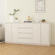 Ces tables de chevet sont fabriquees en bois de pin massif, ce qui garantit leur solidite et leur durabilite. Composees de 2 armoires avec 2 portes et 3 compartiments, 1 armoire avec 4 tiroirs, elles offrent un espace de rangement suffisant pour garder vos differents articles bien organises et a portee de main. Le dessus de table robuste est egalement ideal pour exposer des objets decoratifs, des cadres photo ou des plantes en pot. De plus, ces tables de chevet sont faciles a nettoyer avec un chiffon humide.