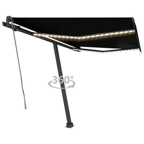 Cet auvent d'exterieur est construit avec un cadre en aluminium enduit de poudre resistant a la rouille, ce qui le rend leger mais robuste. Le tissu de l'auvent autoportant est en polyester haute densite avec revetement de PU, resistant aux UV et a l'eau. De plus, l'angle et la hauteur peuvent etre ajustes selon vos preferences. La base robuste peut pivoter a 360 degres, ce qui permet un ajustement maximal. Vous pouvez facilement ouvrir et retracter l'auvent retractable automatique avec la telecommande incluse. De plus, la longue manivelle permet de controler le store de terrasse en douceur. Il est egalement equipe d'un capteur de vent qui peut fermer votre auvent automatiquement les jours venteux. De plus, les lumieres a LED fournissent un eclairage econome en energie la nuit.