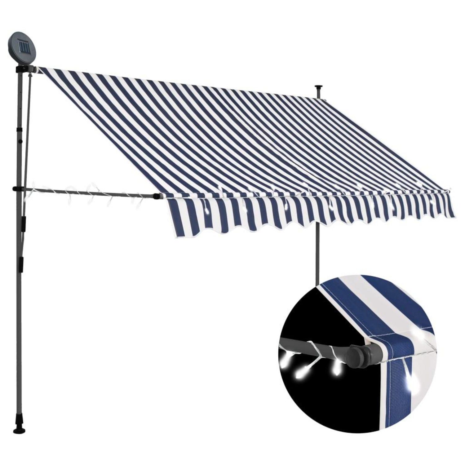 Cet auvent hydrofuge et anti-salissure et resistant aux UV et aux intemperies est fabrique en polyester de qualite avec un revetement PU. Le cadre en acier fort rend l'auvent robuste et durable. L'auvent en polyester facile a nettoyer peut etre retire et lave. Grace a la manivelle de la poignee, ce store est retractable. La hauteur et l'angle du store peuvent egalement etre ajustes. De plus, les lampes LED alimentees par l'energie solaire permettent d'eclairer la nuit. L'auvent est facile a assembler.