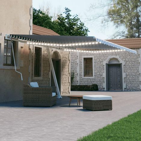 Auvent manuel retractable avec LED 600x300 cm Bleu et blanc