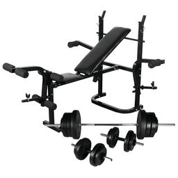 Le banc de musculation complet avec support de poids et ensemble de barre et halteres est un excellent choix pour l'exercice de differents groupes musculaires. C'est un equipement indispensable pour ceux qui debutent dans l'entraînement avec poids et halteres. Executez un entraînement au developpe couche, des flexions des jambes arriere, des abdominaux, des redressements assis et des exercices pectoraux avec notre banc de musculation !