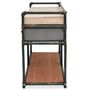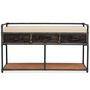 Ce banc robuste et durable est fait d'acier et de bois solide. Il peut avoir quelques imperfections qui ne sont pas intentionnellement faites mais ajoutent neanmoins a l'aspect antique et au charme industriel du banc. Les 3 tiroirs et l'etagere inferieure offrent un espace de rangement suffisant pour garder une grande variete d'articles. Le coussin ajoute au confort d'assise du banc.