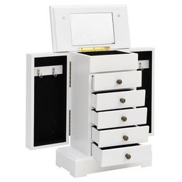 Cette boîte est faite de MDF et dispose d'un miroir en verre. Elle comporte un panneau qui peut etre souleve pour reveler un miroir et un petit compartiment a bijoux. Les deux cotes du meuble peuvent etre ouverts et vous pouvez accrocher vos colliers, bracelets ou bracelets de cheville aux crochets. Conçue avec 5 tiroirs, elle offre beaucoup de place pour vos produits cosmetiques, produits capillaires et soins de la peau. Lorsque le miroir n'est pas utilise, la surface devient alors un endroit ideal pour les petites fournitures.