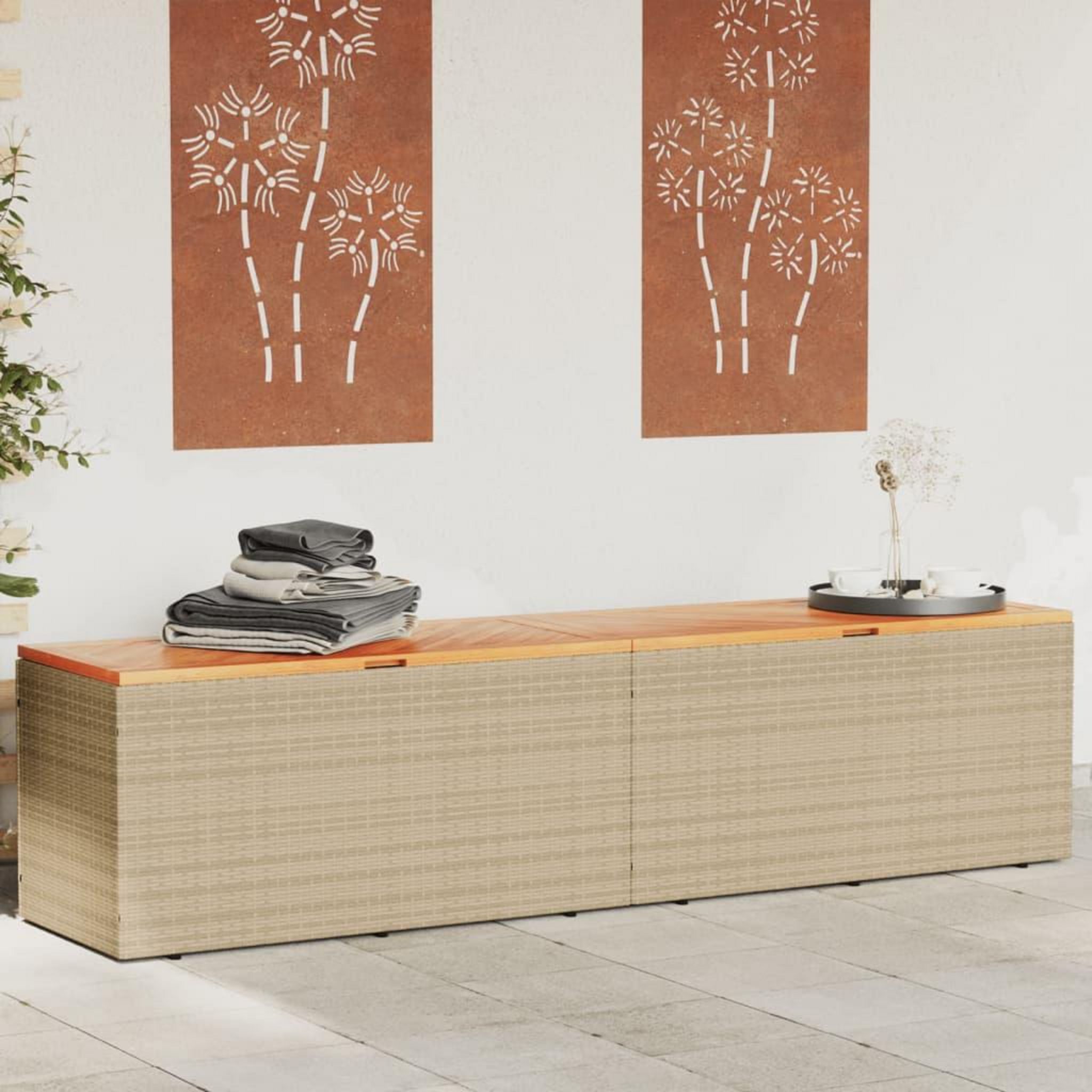 Boîte de rangement de jardin beige resine tressee bois d'acacia