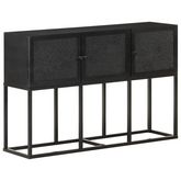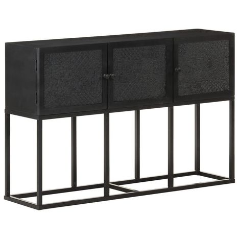 L'armoire laterale est faite de bois de manguier solide, un bois dur tropical avec la force de soutenir le poids. Il resiste egalement a l'usure du temps, ce qui le rend stable et durable. Le cadre en acier enduit de poudre ajoute egalement une stabilite supplementaire. Cette armoire comprend 3 portes offrant un vaste espace de rangement. De plus, le dessus en bois robuste est ideal pour exposer des objets decoratifs tels que des cadres photo, des plantes en pot, des vases, etc.