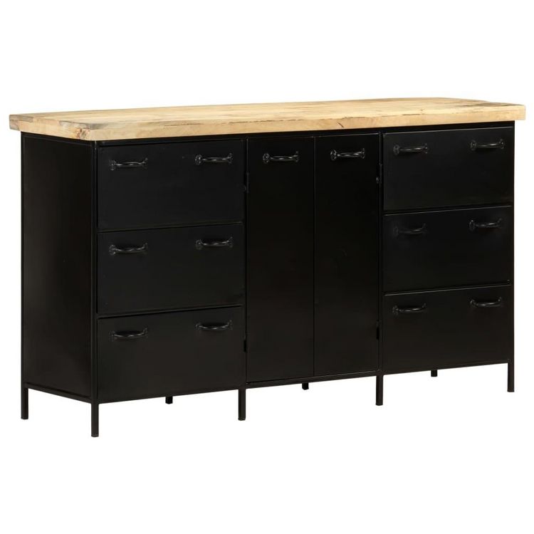 L'armoire laterale est faite de bois de manguier brut, un bois dur tropical avec la force de soutenir le poids. Il resiste egalement a l'usure du temps, ce qui le rend stable et durable. Le cadre en acier enduit de poudre ajoute egalement une stabilite supplementaire. Cette armoire comprend 6 tiroirs et 2 portes offrant un vaste espace de rangement. De plus, le dessus en bois robuste est ideal pour exposer des objets decoratifs tels que des cadres photo, des plantes en pot, des vases, etc.