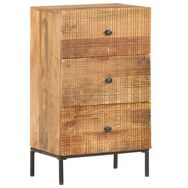L'armoire laterale, avec des motifs sculptes a la main a l'avant, est faite a la main en bois de manguier massif qui est un bois dur dense et robuste avec des belles stries et des contours bruns ou dores sur sa surface. Chaque etape du processus est realisee avec le plus grand soin, qu'il s'agisse de polissage ou de laquage, et le savoir-faire ajoute au style retro spectaculaire. Les beaux grains de bois rendent chaque meuble unique et legerement different l'un de l'autre. Le cadre en acier enduit de poudre ajoute au style industriel du buffet. En outre, cette armoire comprend 3 tiroirs, offrant suffisamment d'espace pour garder toutes sortes de petits objets organises et a portee de main. L'article est facile a assembler.