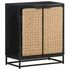 L'armoire laterale est en bois de manguier massif, un bois dur tropical ayant la force de soutenir le poids. Il resiste egalement a l'usure du temps, ce qui le rend stable et durable. La porte est en jute naturel et la base en fer ajoute egalement une stabilite supplementaire. Cette armoire de rangement comprend deux portes offrant un grand espace de rangement.