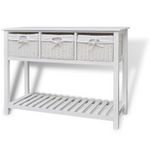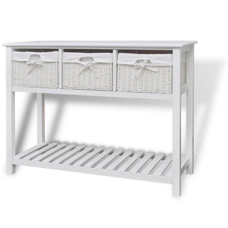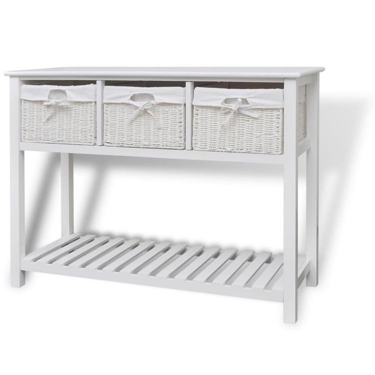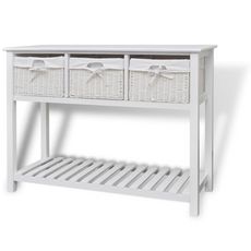 Ce buffet blanc de rangement, minimaliste romantique, avec paniers tisses presente une excellente solution de rangement pour la chambre a coucher, le couloir ou la salle de bain. Cette unite de stockage, faite de materiau de haute qualite, a trois paniers tisses et un niveau inferieur en lattes. Cha