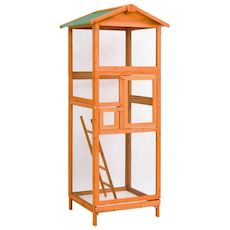 Avec un cadre en bois de sapin de haute qualite, la maison pour oiseaux est solide et durable. Le tissu resistant a l'eau sur le toit previent l'infiltration de la pluie. Une echelle permet aux oiseaux de monter et de descendre facilement. Le plateau coulissant en bas de la cage pour oiseaux facilite le nettoyage. La cage dispose de deux portes, la plus grande pour nettoyer et la petite pour nourrir. Les deux portes sont verrouillables avec des loquets coulissants.