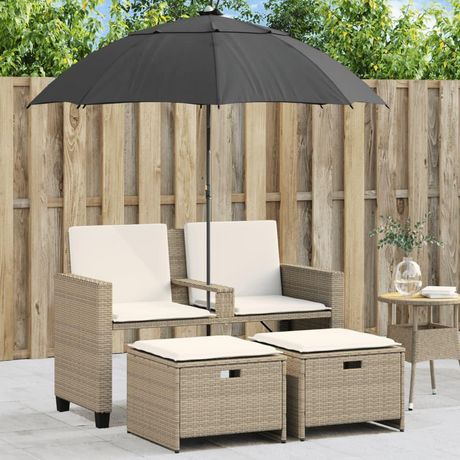Canape de jardin 2 places avec parasol et tabourets beige rotin