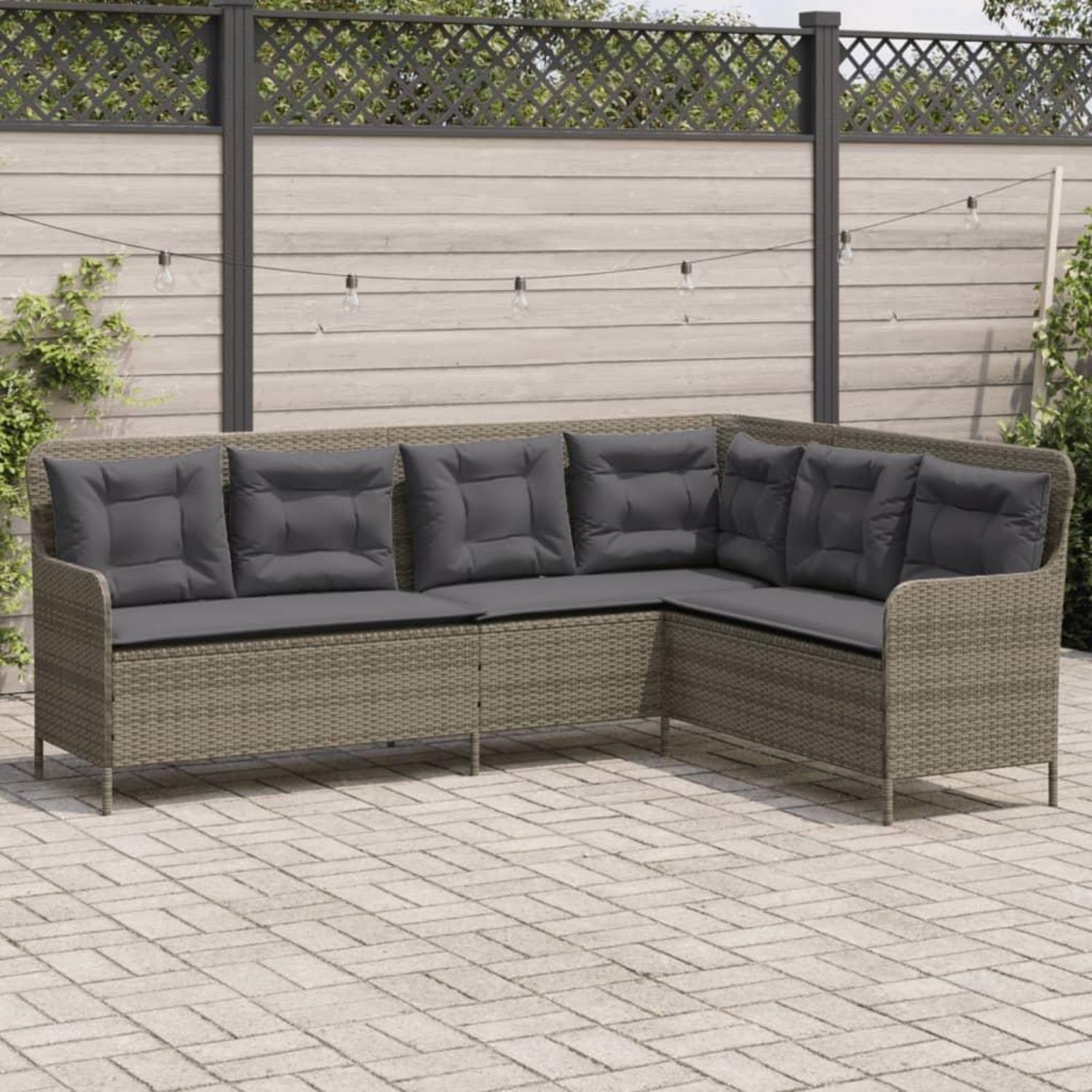 Canape de jardin avec coussins forme de L gris resine tressee