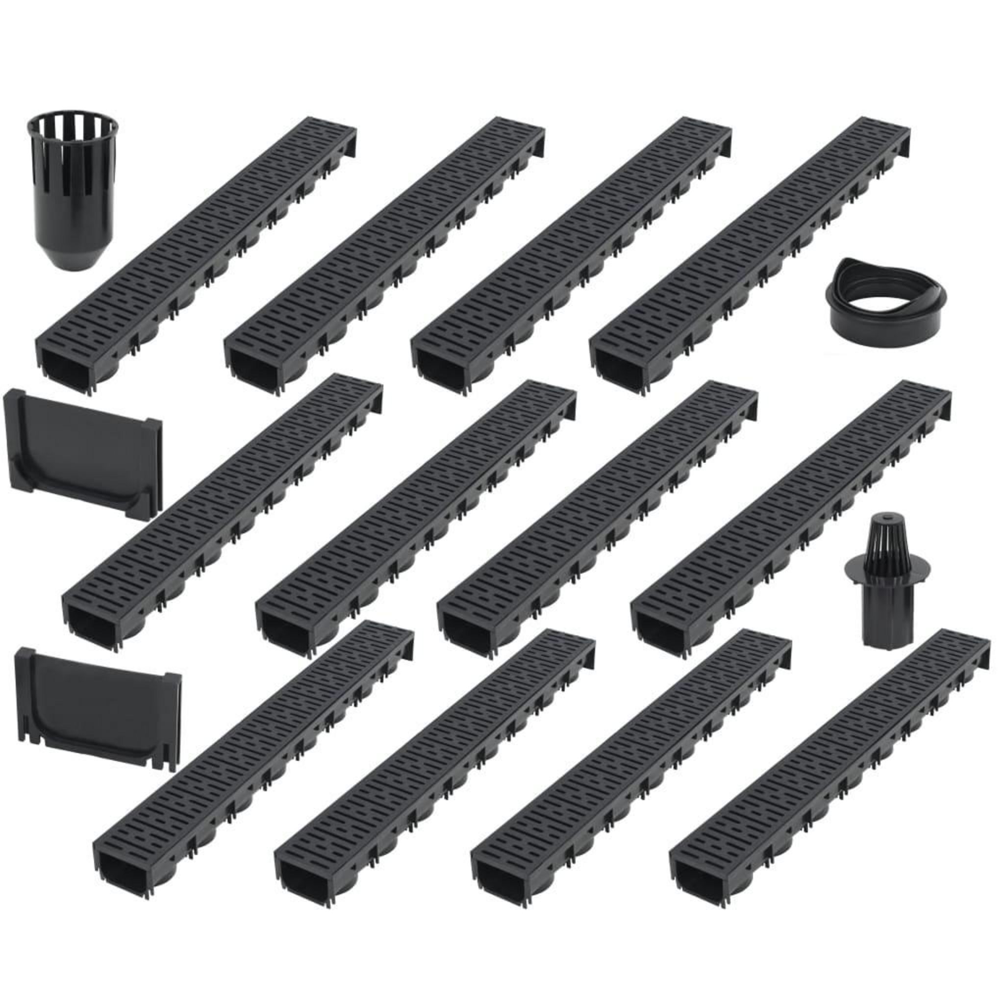 Cet ensemble complet se compose de 12 caniveaux de drainage avec grilles en plastique, 1 systeme de filtration, 1 raccord de sortie inferieur et 2 embouts. Il constitue une solution parfaite pour la collecte et l'elimination de l'exces d'eau dans les allees, les patios et autres espaces exterieurs.