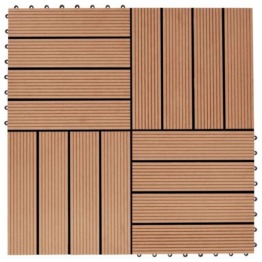 En savoir +Cet ensemble de carreaux de terrasse WPC, d'une taille individuelle de 30 x 30 cm, se compose de 11 pieces et couvre une surface totale d'un metre carre. Il sera parfait pour les patios, les balcons, les salles de bains, ou votre piscine ou spa.