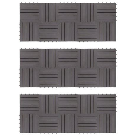 Cet ensemble de 30 tuiles de terrasse en bois dur est parfait pour orner les surfaces ou les allees dans votre jardin, sur votre terrasse ou balcon, ou dans toute autre piece. Le motif n'est pas seulement decoratif, mais ajoute une qualite antiderapante. Les carreaux de terrasse sont en bois d'acaci