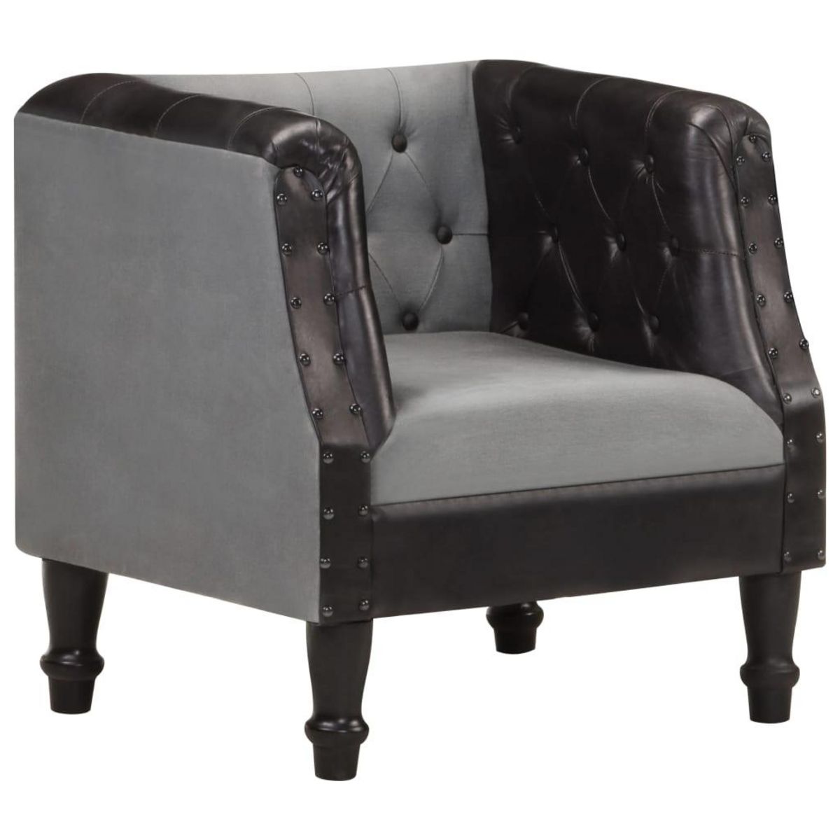 Ce fauteuil est rembourre en veritable cuir de chevre et toile, qui est doux au toucher. Le fauteuil est soutenu par des pieds en bois de manguier massif, ajoutant plus de robustesse et de stabilite. De plus, le rembourrage est fini avec des rivets pour un aspect et une sensation industriels. Les accoudoirs incurves, l'assise et le dossier bien rembourres font du canape en cuir l'endroit ideal pour vous asseoir confortablement.