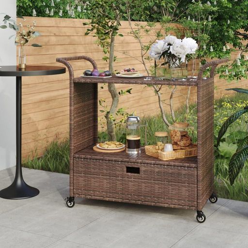 Ce chariot est fabrique en resine tressee resistante aux intemperies et necessite moins d'entretien. Il est adapte a une utilisation quotidienne. Le chariot de jardin dispose d'un tiroir afin d'eviter que les aliments ne tombent sur le sol. Le cadre en acier enduit de poudre maintient le chariot de service stable et robuste. La poignee sur le dessus le rend facile a pousser et a tirer. Grace aux roulettes, le chariot peut etre deplace sans effort. De plus, deux des roulettes ont une fonction de verrouillage pour empecher le chariot de rouler.