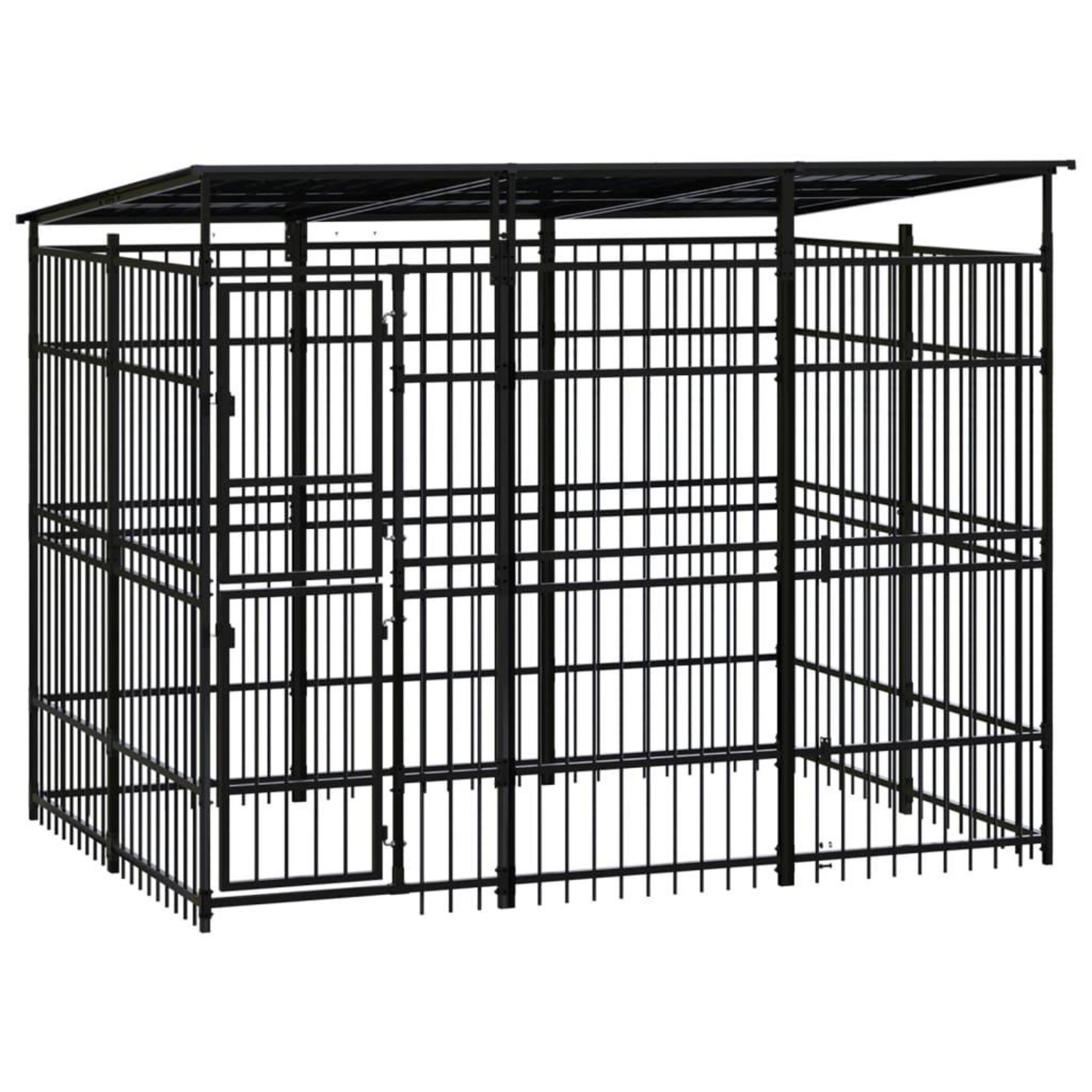 Ce chenil pour chien offre un grand espace d'exercice. Les murs en barres d'acier permettent d'eviter les mefaits et les accidents inattendus tout en permettant la ventilation. Grace a la construction robuste en acier enduit de poudre, ce chenil pour chien est durable et conçu pour durer. Le toit offre une protection contre le soleil, la pluie, la neige, ainsi que d'autres conditions meteorologiques. La porte a charnieres avec un systeme de loquet verrouillable assure une securite supplementaire a vos chiens.
