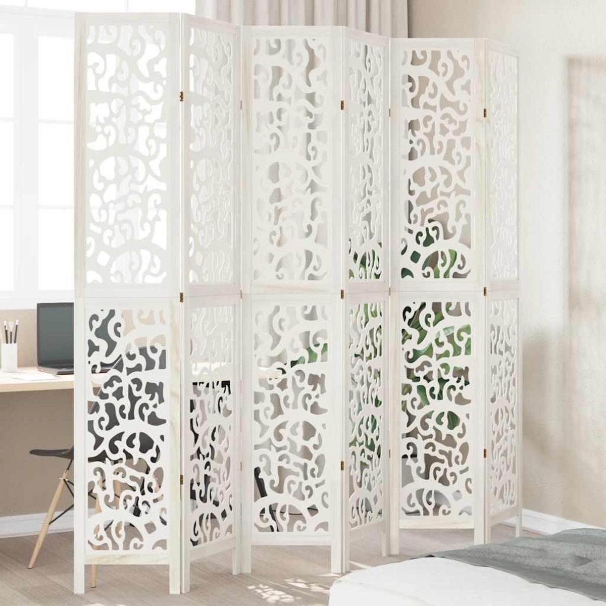 Cloison de separation 6 panneaux blanc bois de paulownia massif