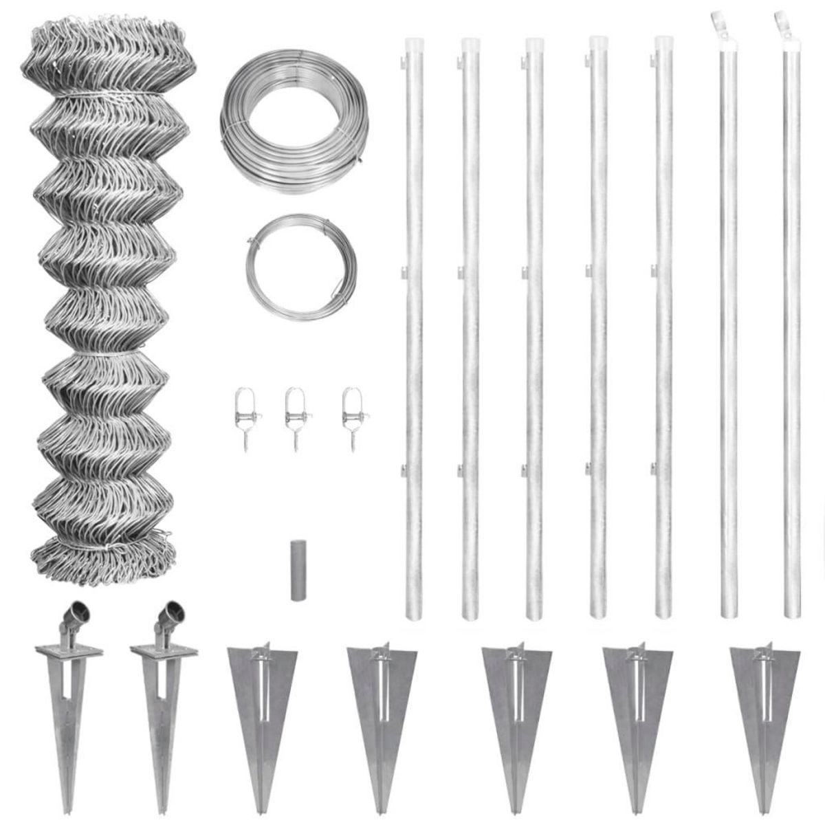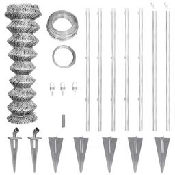 Tous les accessoires de montage necessaires sont inclus dans l'emballage ! La livraison comprend 1 cloture a mailles galvanisees, 5 poteaux galvanises, 5 piquets d'ancrage galvanises pour les poteaux, 2 piquets diagonaux galvanises, 2 piquets d'ancrage galvanises pour les poteaux diagonaux, 1 fil superieur, 1 fil de liaison et 3 tendeurs de fil.