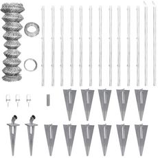 Tous les accessoires de montage necessaires sont inclus dans l'emballage ! La livraison comprend 1 cloture a mailles galvanisees, 11 poteaux galvanises, 11 piquets d'ancrage galvanises pour les poteaux, 2 piquets diagonaux galvanises, 2 piquets d'ancrage galvanises pour les poteaux diagonaux, 1 fil superieur, 1 fil de liaison et 3 tendeurs de fil.