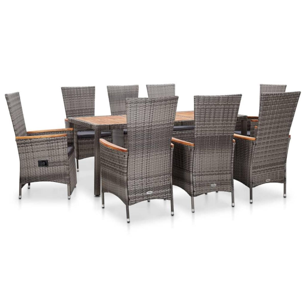 Cet ensemble a dîner en rotin au design elegant et contemporain sera un excellent choix pour manger en plein air ou vous detendre dans le jardin. Fait de resine tressee resistante aux intemperies et a l'eau, l'ensemble a dîner est facile a nettoyer, resistant a l'usure et adapte a une utilisation quotidienne. Les cadres en acier enduit de poudre rendent la table et les chaises solides et robustes. Le dessus de table et les accoudoirs sont fabriques en bois d'acacia, un bois dur tropical, qui apportera du charme rustique. 2 des 8 chaises sont des chaises inclinables grace au dossier et au repose-pied reglables. En touchant le bouton sur le cote, le dossier s'inclinera et le repose-pieds montera en meme temps, pour une position allongee confortable. Grace a leur construction legere, tous les elements sont faciles a deplacer.