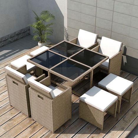 Ensemble a manger d'exterieur et coussins 9 pcs resine tressee