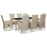 Cet ensemble de salle a manger en rotin a un design elegant et contemporain et sera un excellent choix pour manger en plein air ou vous detendre dans le jardin. Fabrique en resine tressee resistante aux intemperies et a l'eau, l'ensemble de salle a manger est facile a nettoyer, resistant a l'usure et adapte a un usage quotidien. Les cadres en acier enduit de poudre rendent la table et les chaises fortes et robustes. Le dessus de table est en verre, ce qui le rend facile a nettoyer. 2 des 8 chaises sont des chaises inclinables grace au dossier reglable. En touchant le bouton sur le cote, le dossier s'incline. Grace a leur construction legere, tous les articles sont faciles a deplacer.