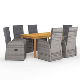 La table de salle a manger est fabriquee en bois d'acacia massif avec une finition a l'huile, ce qui la rend stable, durable et facile a entretenir. Dotees d'un cadre en acier enduit de poudre recouvert de resine tressee resistante aux intemperies, ces chaises de salle a manger sont robustes et faciles a nettoyer. Le dossier s'inclinera en tirant sur le bouton situe sur le cote. Grace a leur construction legere, les chaises sont faciles a deplacer. Elles sont egalement livrees avec des coussins hautement confortables et bien rembourres pour un confort supreme. Les housses en polyester necessitant peu d'entretien peuvent egalement etre enlevees et lavees.