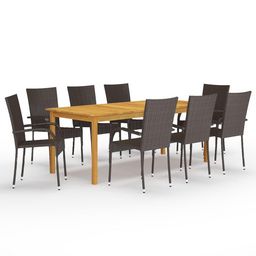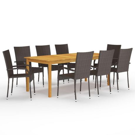 La table de salle a manger est en bois d'acacia massif avec une finition a l'huile, ce qui la rend stable, durable et facile a entretenir. Dotees d'un cadre en acier enduit de poudre recouvert de resine tressee resistante aux intemperies, ces chaises sont robustes et faciles a nettoyer. Les chaises d'exterieur sont legeres et peuvent etre empilees pour gagner de la place lorsqu'elles ne sont pas utilisees.