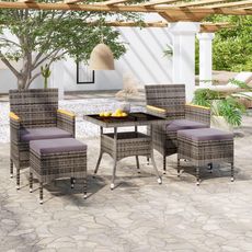 Avec un cadre en acier enduit de poudre recouvert de resine tressee resistante aux intemperies avec protection UV, la table et les chaises sont durables et stables. Conçues avec un dossier et des accoudoirs incurves, les chaises vous offrent du confort. Les coussins sont inclus pour plus de confort et la housse a fermeture eclair est amovible pour un lavage facile. Le dessus de table est en verre trempe renforce avec un support resistant, facile a nettoyer et a entretenir. Les deux repose-pieds vous offrent egalement des places d'assise supplementaires. De plus, la construction legere rend chaque piece facile a deplacer, a reorganiser et a transporter.