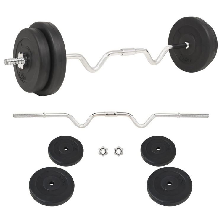 Cet ensemble d'halteres polyvalent est parfait pour les muscles de la poitrine, des biceps, des bras, des triceps et du dos. Il comprend deux disques de 7,5 kg, deux disques de 5 kg et une barre d'halteres de 5,4 kg et pese environ 30 kg.