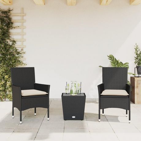 Ensemble de bistro avec coussins 3pcs noir resine tressee verre
