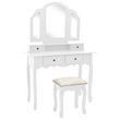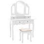 Cette table de maquillage comprend un miroir de table 3 en 1, dont 2 miroirs lateraux sont pliables avec des charnieres durables. Vous pouvez egalement les tourner a l'angle souhaite. Etonnamment, le cadre du miroir et la table peuvent etre utilises separement. De plus, les 4 tiroirs chics vous offrent un espace supplementaire pour vos ornements, cosmetiques et autres articles essentiels. Cet ensemble de table et de tabouret cosmetique attire certainement le regard, dans n'importe piece.