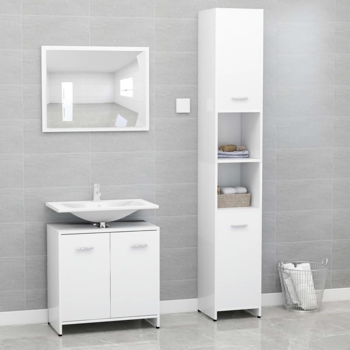Cet elegant ensemble de meubles de salle de bain, avec 1 armoire haute, 1 armoire sous lavabo et 1 miroir, cree un espace de rangement supplementaire pour votre salle de bain avec un aspect superbe et soigne.
