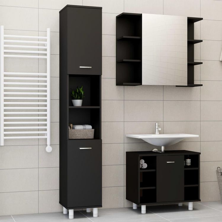Cet elegant ensemble de meubles de salle de bain comprend 1 armoire haute, 1 armoire sous lavabo et 1 armoire a miroir. Il cree un espace de rangement supplementaire pour votre salle de bain avec un aspect superbe et soigne.