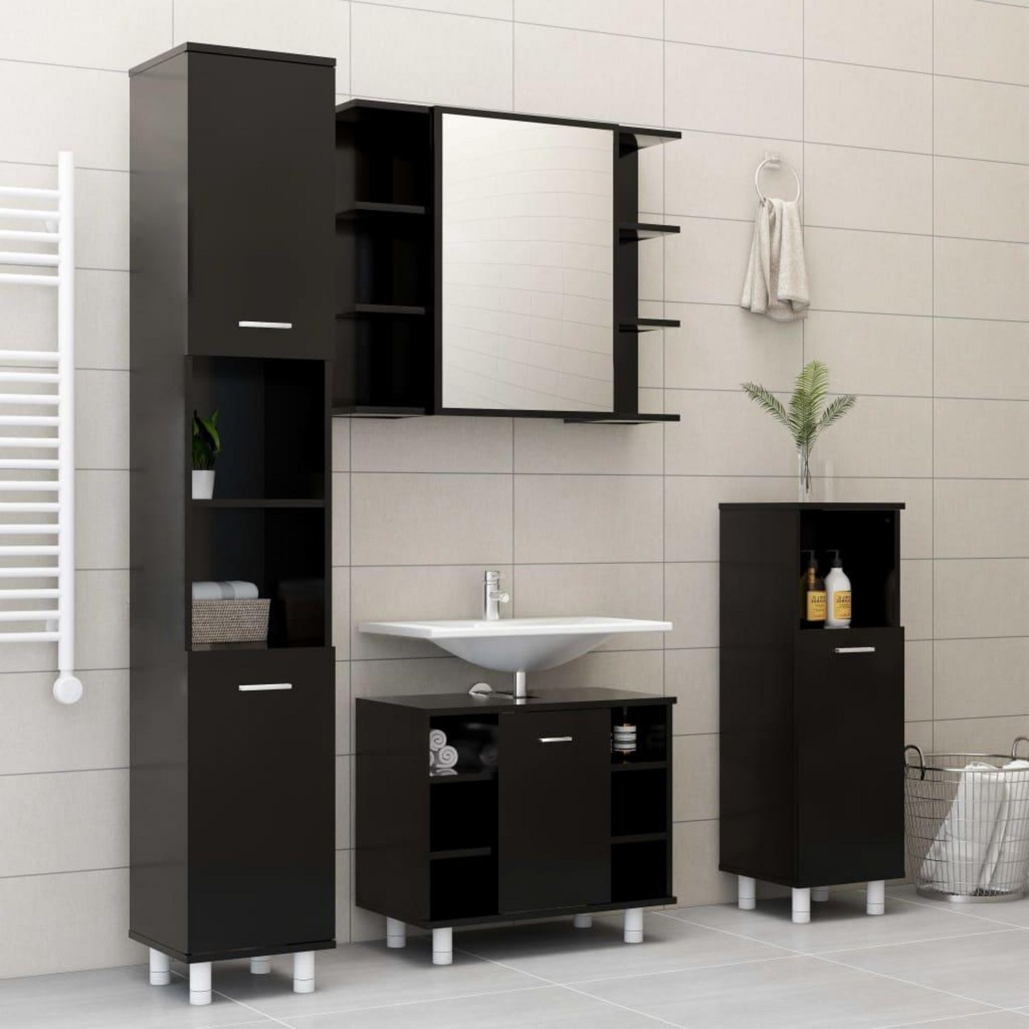 Cet elegant ensemble de meubles de salle de bain comprend 1 armoire haute, 1 armoire de taille moyenne, 1 armoire sous lavabo et 1 armoire a miroir. Il cree un espace de rangement supplementaire pour votre salle de bain avec un aspect superbe et soigne.