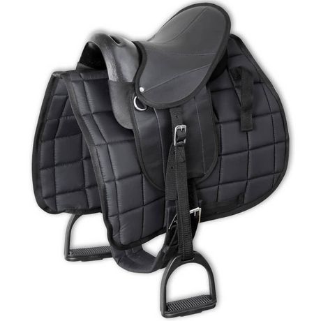Cet ensemble de selle, y compris une selle, une couverture de selle, des etriers, des ceintures d'etrier et une sous-ventriere, est conçu pour placer le cavalier dans la position correcte, assurant ainsi une chevauchee sure et equilibree.